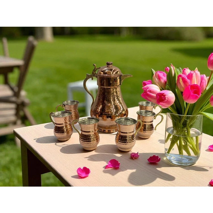 Bakır Dünyası – 7 Parça El İşçiliği Kapaklı Bakır Sürahi Takımı (2 L Sürahi + 6 Bardak)